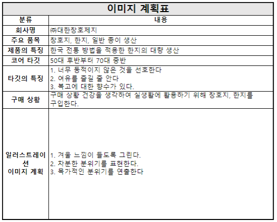 - 이미지 계획표의 회사명 : 주로 광고주 또는 발주 업체를 쓴다. 현재 캘린더 제작이 진행중이므로 회사명에 들어가는 회사는 캘린더를 발주한 회사명을 넣은 것으로 가정하고 써볼 수 있다.