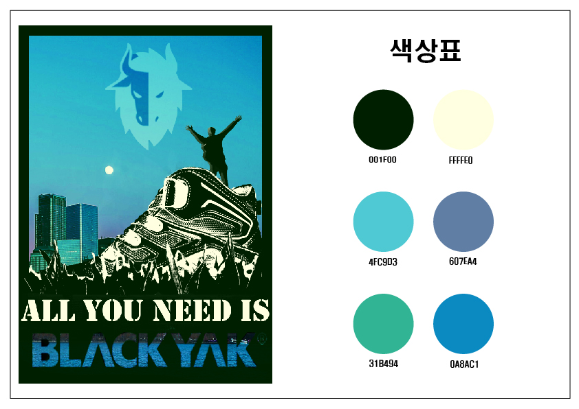 포스터는 두 가지 컨셉이다. 하나는 스포츠브랜드 '나이키'를 주제로 '걷기'에 관한 활동을 촉구하고 있으며, 다른 하나는 블랙야크 등산화를 산처럼 형상화해서 블랙야크 등산화를 부각시킨 포스터 두 가지로 제작해 보았다.